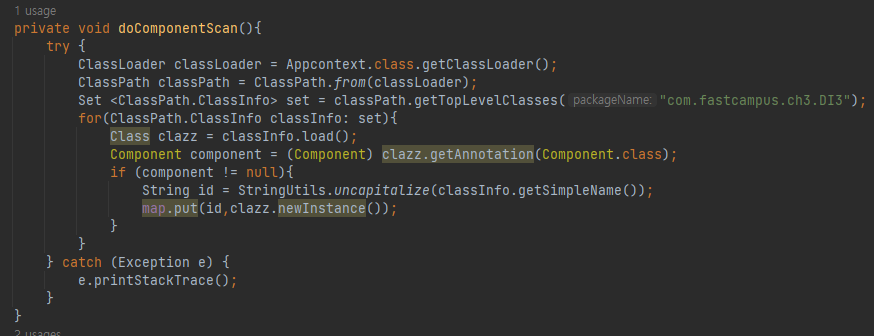 → spring container에서 읽어드리고 클래스/객체관리, bean저장/관리(생성, 소멸, 연결(AutoWired))